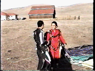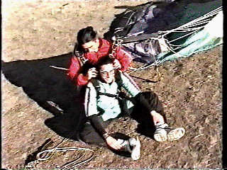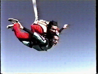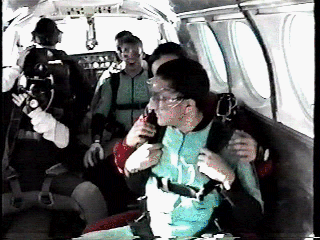 It was a beautiful day. We got on a small one-propeller plane (about 10 of us). I believe there was more risk of us crashing because of the plane, than our parachutes not opening. I was somewhat nervous, but I've been more nervous on amusement park rides. However, matters weren't helped much when a student skydiving who was applying for her license and was doing her first solo jump panicked and had to be literally pushed out of the plane (as I was waiting on the ground, I was ready to jump solo, but I think jumping by yourself and jumping tandem are two very different ballgames)! I was jumping tandem and was thus attached to my instructor Yoshi. After we dropped off the student at 15,000 feet, we climbed to an altitude of 18,000 for which we had to wear oxygen masks.